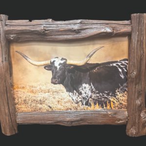 Longhorn printed on a fine art paper. Rustic juniper old fence wood frame. Approx. 16″ x 22.5″. With hanger.